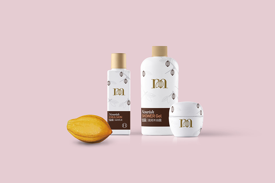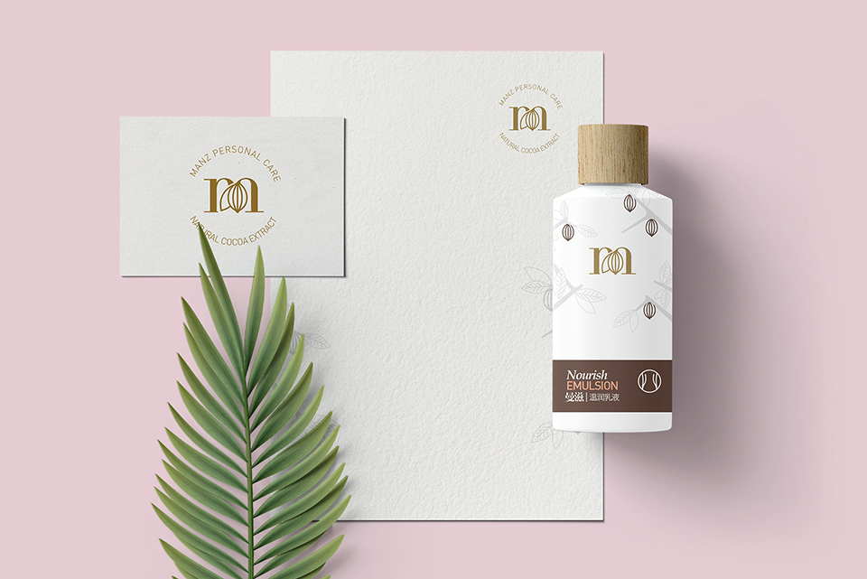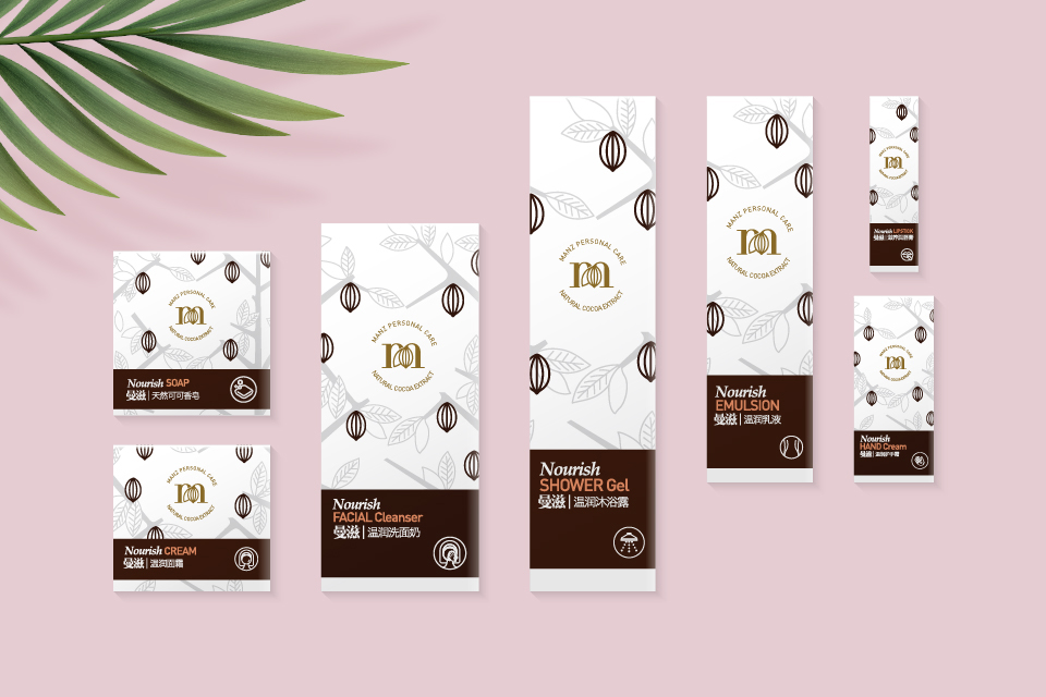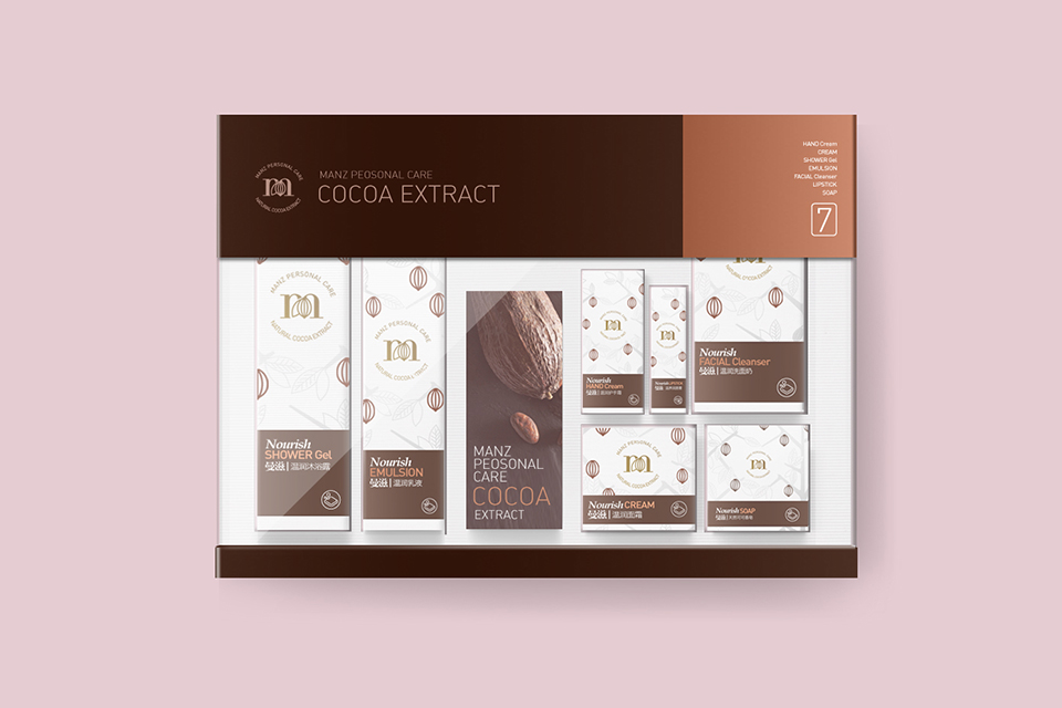 接到客戶委托,需要做一個化妝品品牌的設計方案。根據溝通,客戶想產品看起來如食物一樣可口誘人,包裝顏色要為深棕色。所以在做了大量的研究和討論過后,決定產品底紋配以樹葉和符合深棕色的可可植物原型,融合深棕色的主色調,凸顯產品的大氣。產品看起來如巧克力一般甜美誘人,雖不能吃,但給人以健康,放心的心理暗示。品牌logo的設計以曼滋首字母為主體,簡單,高雅,讓人看后印象深刻。